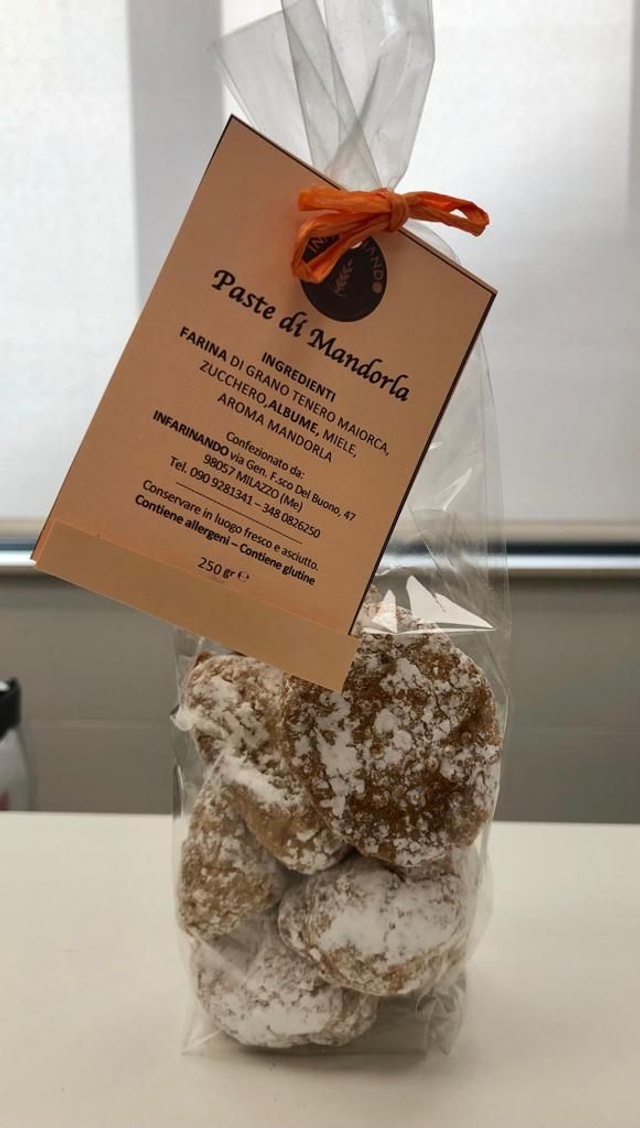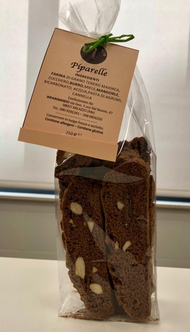 Porta l'incanto della Sicilia sulla tua tavola. La Box Biscotti offre una vasta selezione di biscotti preparati esclusivamente con le nostre farine di grani antichi siciliani. I BISCOTTI FROLLA sono un tripudio di dolcezza e fragranza. La frolla, preparata con amore e attenzione, si sbriciola delicatamente in bocca; ogni lotto di Biscotti di Frolla è realizzato a mano rispettando le ricette tramandate di generazione in generazione. Le PIPARELLE: sono un'aggiunta deliziosa a qualsiasi tavola festiva, perfetti per accompagnare il caffè o il tè, o per essere gustati da soli. Solo mandorle di altissima qualità, cannella e arancia dal sapore autentico e deciso. Le PASTE di MANDORLA sono vere e proprie prelibatezze che si scioglieranno lentamente in bocca, rivelando un gusto ricco e avvolgente che evoca l'aroma e la generosità della Sicilia. Le REGINELLE sono un mix perfetto di dolcezza e croccantezza ricoperte di semi di sesamo. Senza conservanti o coloranti artificiali -Conf. da 250gr